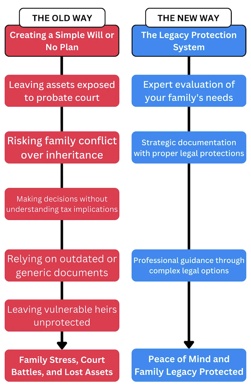 By examining hundreds of estate planning cases, we discovered the Legacy Protection System that successful families have been quietly using for years to maximize protection and minimize costs.
